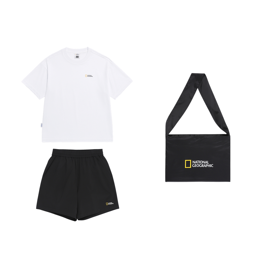 - Coordinated set featuring a short-sleeve T-shirt, matching shorts, and a bag for an effortlessly styled look